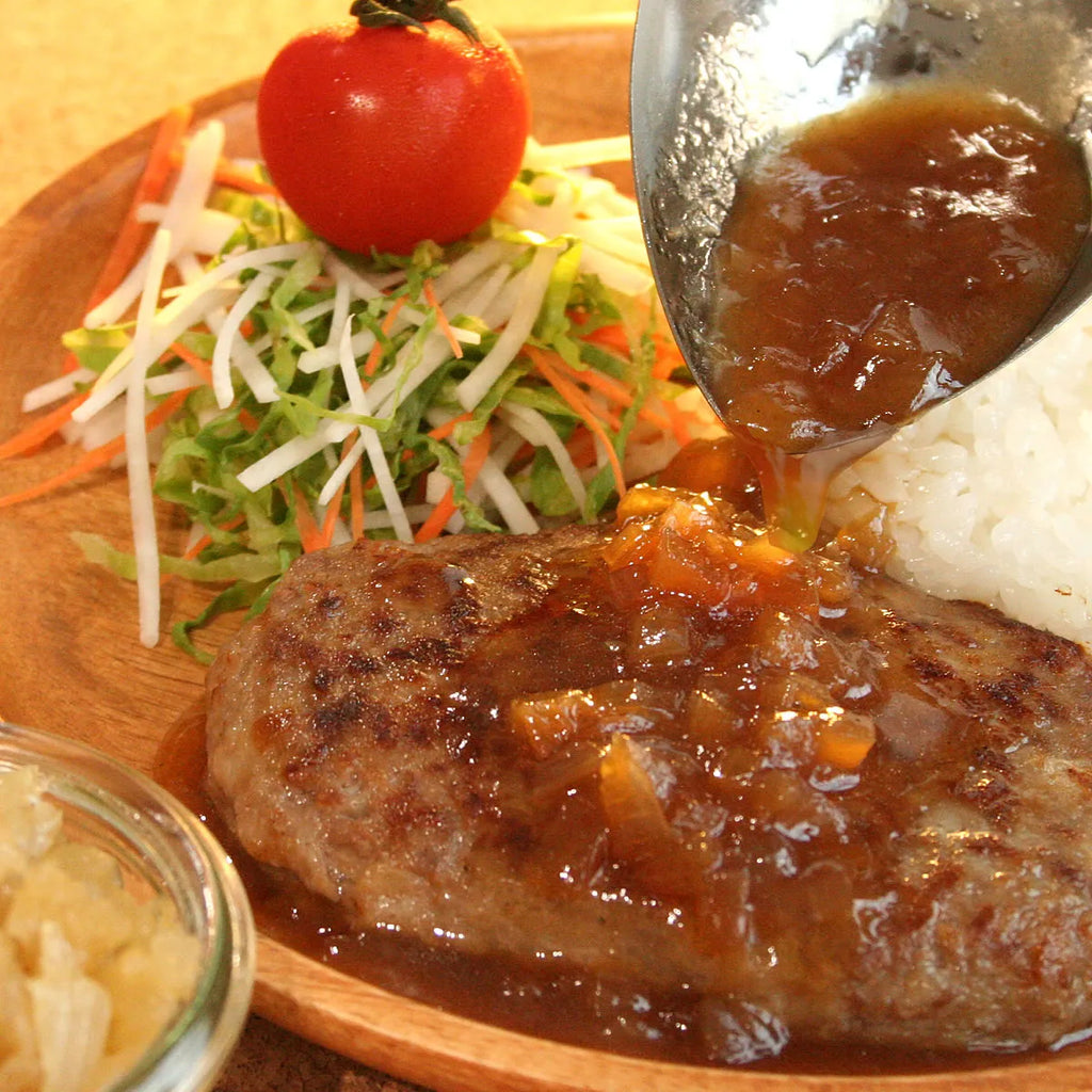 キャラメルオニオンと北海道産肉の旨みたっぷりの柔らかなハンバーグに仕上げました。