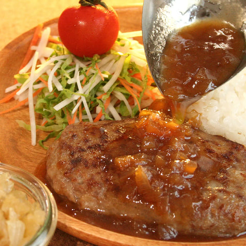 ハンバーグソース:玉ねぎ、リンゴ酢、しょうゆ、砂糖、コンソメ、サラダ油、コーンスターチ、食塩、調味料